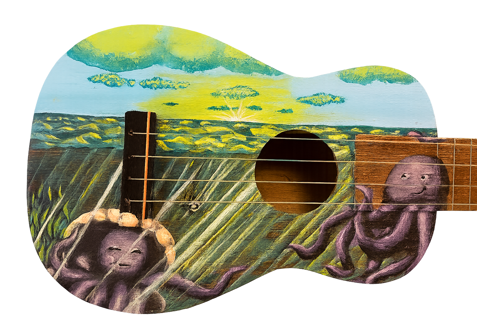 Keywords: hand-painted guitar, ocean guitar art, unique acoustic guitar, octopus guitar, coastal décor, nautical wall art, musician gift, one-of-a-kind guitar